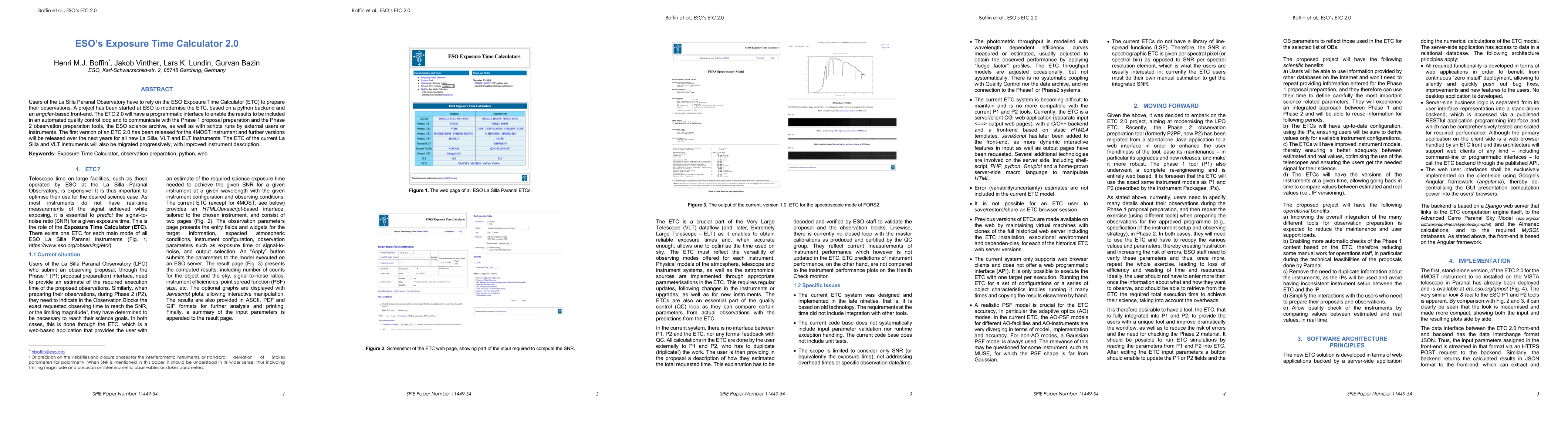 The ESO Exposure Time Calculator 2.0 modernizes the ETC with a Python backend and Angular front-end, enabling automated quality control and integration with proposal preparation and observation tools. Initial versions are released for 4MOST, with future updates planned for all La Silla, VLT, and ELT instruments.