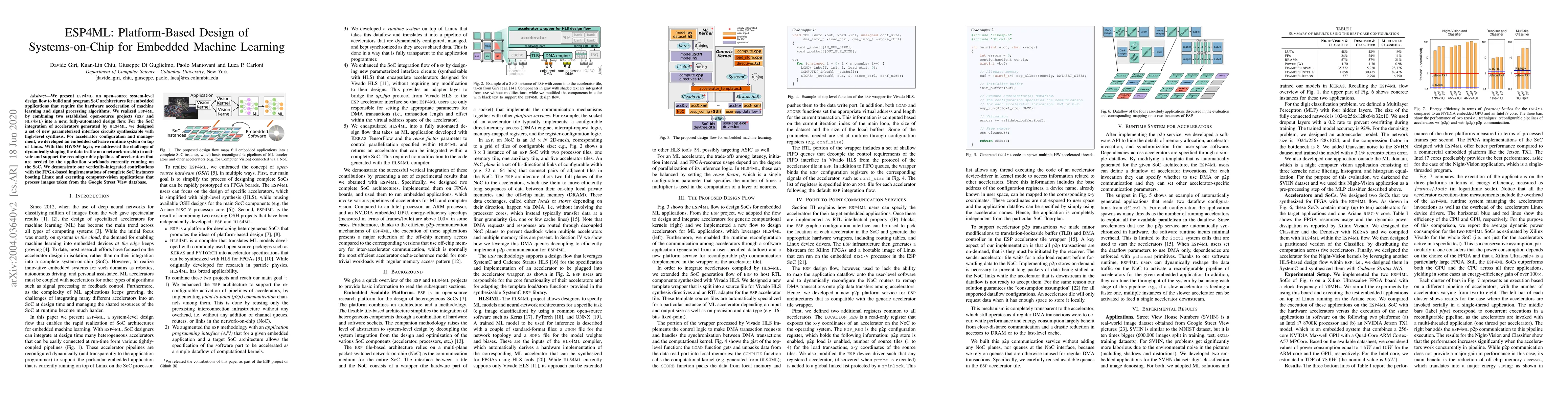 ESP4ML is an open-source design flow for creating SoC architectures that accelerate machine learning and signal processing. It integrates hardware and software layers to dynamically manage data traffic on a network-on-chip, demonstrated through FPGA implementations running Linux and computer-vision applications.
