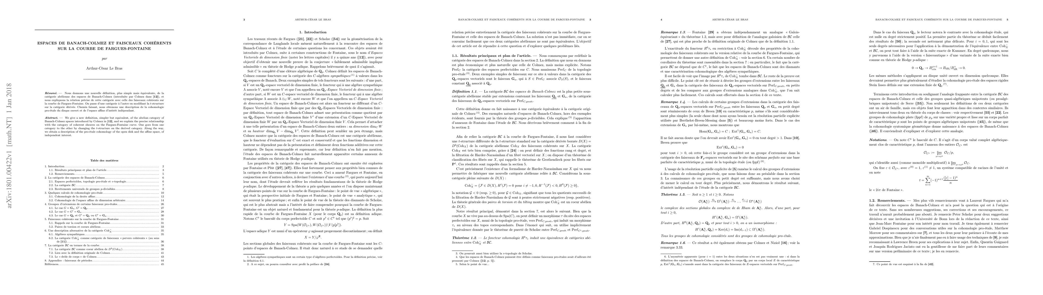 We give a new definition, simpler but equivalent, of the abelian category of Banach-Colmez spaces introduced by Colmez, and we explain the precise relationship with the category of coherent sheaves on the Fargues-Fontaine curve. One goes from one category to the other by changing the t-structure on the derived category. Along the way, we obtain a description of the pro-\'etale cohomology of the open disk and the affine space, of independent interest.