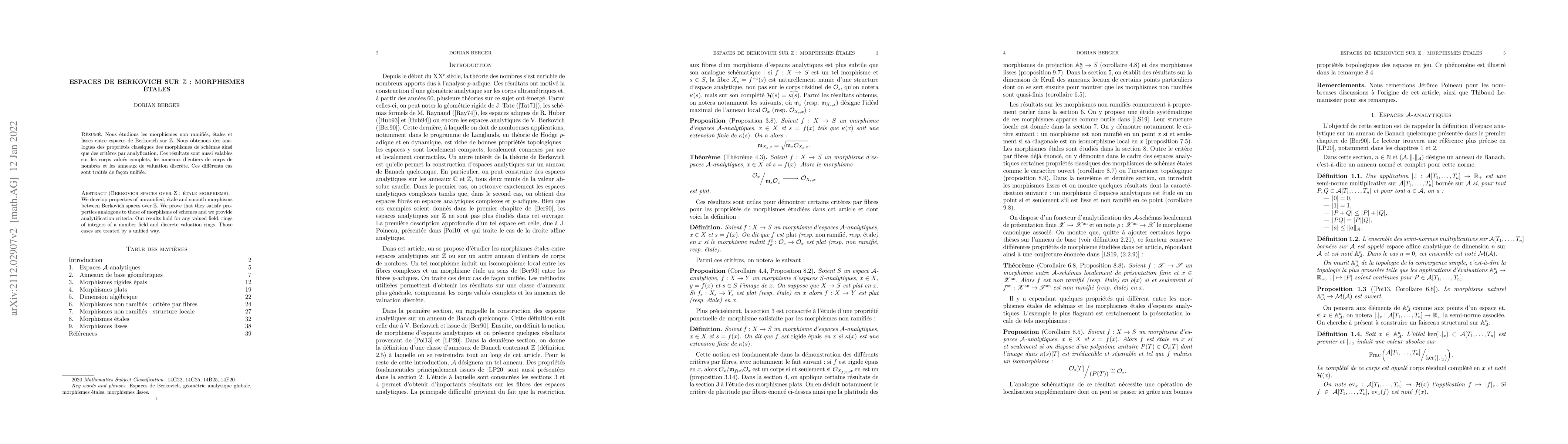 We develop properties of unramified, \'etale and smooth morphisms between Berkovich spaces over $\mathbb{Z}$. We prove that they satisfy properties analogous to those of morphisms of schemes and we provide analytification criteria. Our results hold for any valued field, rings of integers of a number field and discrete valuation rings. Those cases are treated by a unified way.