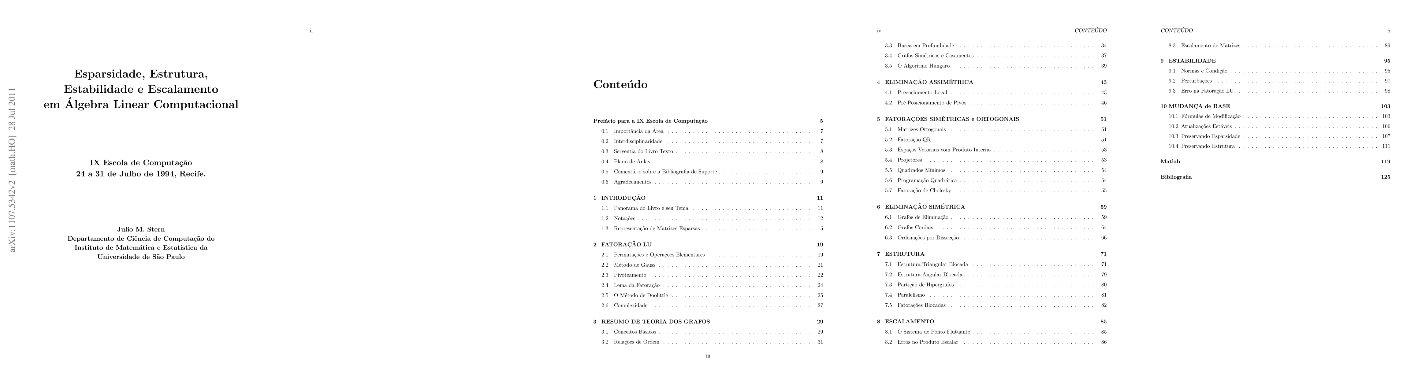 Sparsity, Structure, Scaling and Stability in Computational Linear Algebra - Textbook from the IX School of Computer Science, held on July 24-31 of 1994 at Recife, Brazil. Esparsidade, Estrutura, Escalamento e Estabilidade em Algebra Linear Computacional - Livro texto da IX Escola de Computacao, realizada nos dias 24 a 31 de Julho de 1994 em Recife, Brasil. This textbook is written in Portuguese Language.