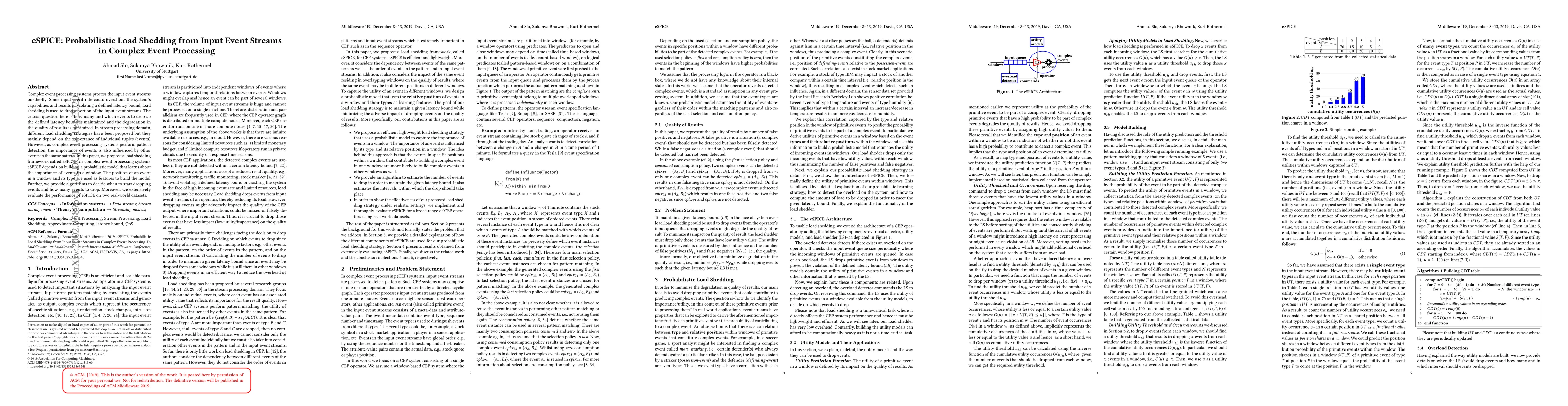 eSPICE is a probabilistic load shedding framework for complex event processing systems that builds a model to determine event importance based on patterns and temporal position. It offers algorithms to decide when and how many events to drop to maintain latency bounds while minimizing quality degradation.