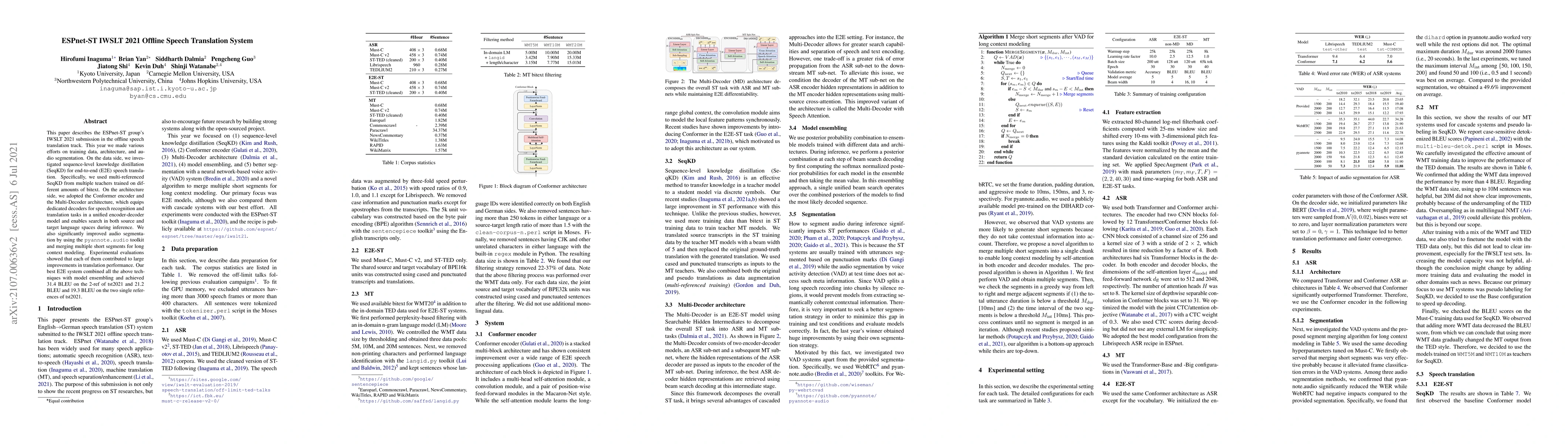 The ESPnet-ST group's IWSLT 2021 offline speech translation system improved translation performance through sequence-level knowledge distillation, Conformer encoder, Multi-Decoder architecture, and enhanced audio segmentation. The best model achieved 31.4 BLEU on 2-ref and 21.2/19.3 BLEU on single references.