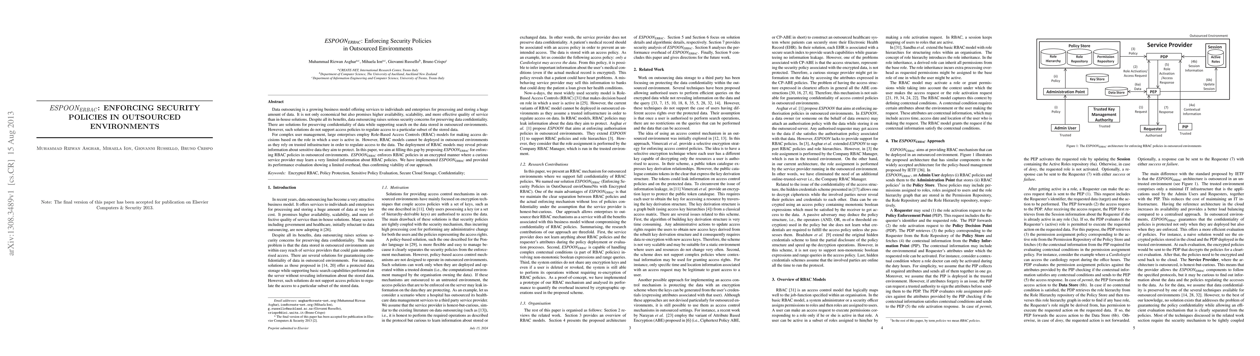 This paper proposes ESPOON$_{{ERBAC}}$, a method to enforce Role-Based Access Control (RBAC) policies in outsourced data environments while maintaining data confidentiality. The approach encrypts RBAC policies to limit the service provider's knowledge, demonstrating limited performance overhead through implementation and evaluation.