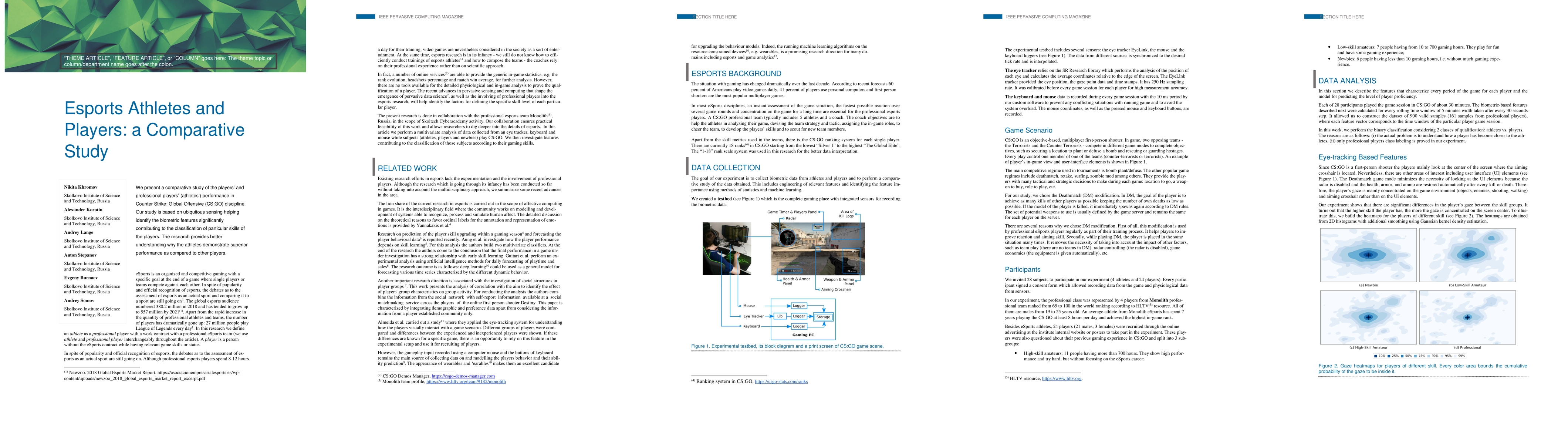 We present a comparative study of the players' and professional players' (athletes') performance in Counter Strike: Global Offensive (CS:GO) discipline. Our study is based on ubiquitous sensing helping identify the biometric features significantly contributing to the classification of particular skills of the players. The research provides better understanding why the athletes demonstrate superior performance as compared to other players.