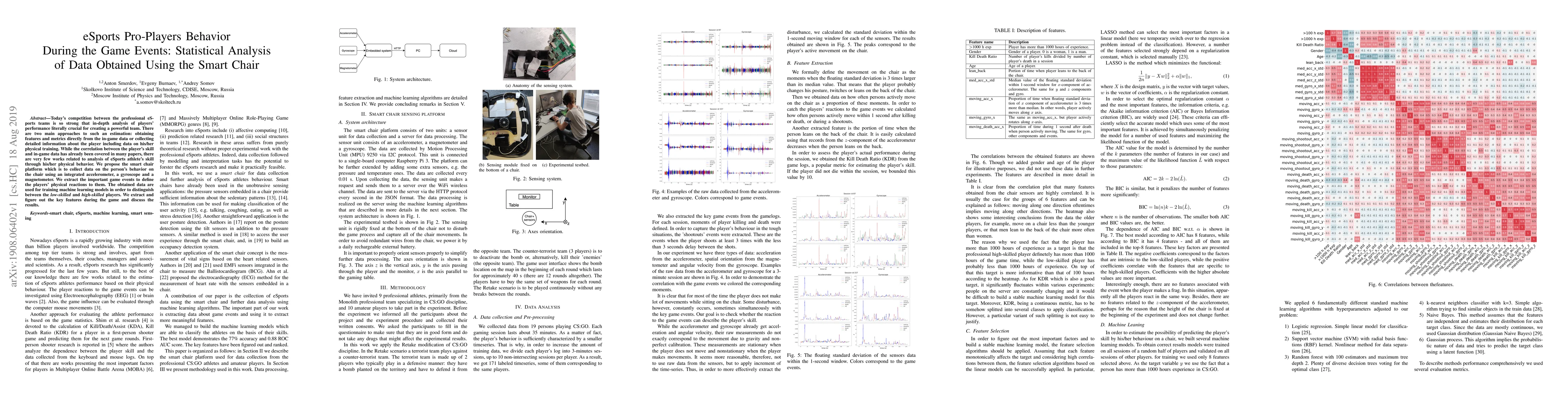 Today's competition between the professional eSports teams is so strong that in-depth analysis of players' performance literally crucial for creating a powerful team. There are two main approaches to such an estimation: obtaining features and metrics directly from the in-game data or collecting detailed information about the player including data on his/her physical training. While the correlation between the player's skill and in-game data has already been covered in many papers, there are very few works related to analysis of eSports athlete's skill through his/her physical behavior. We propose the smart chair platform which is to collect data on the person's behavior on the chair using an integrated accelerometer, a gyroscope and a magnetometer. We extract the important game events to define the players' physical reactions to them. The obtained data are used for training machine learning models in order to distinguish between the low-skilled and high-skilled players. We extract and figure out the key features during the game and discuss the results.