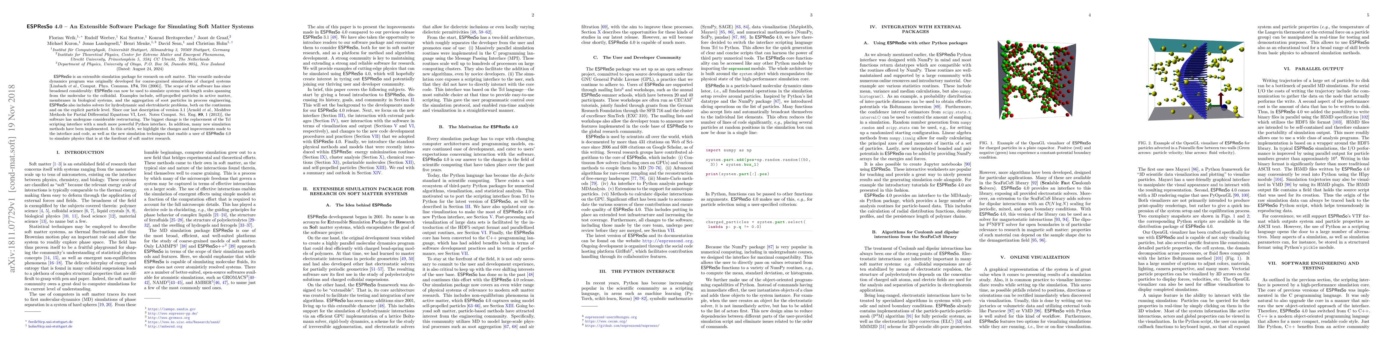 ESPResSo 4.0 is an advanced, extensible molecular dynamics simulation package for soft matter research, now featuring a powerful Python interface and expanded capabilities for simulating systems from molecular to colloidal scales. The software includes new solvers for hydrodynamic and electrokinetic problems and supports simulations of active matter, biological membranes, and soot aggregation.