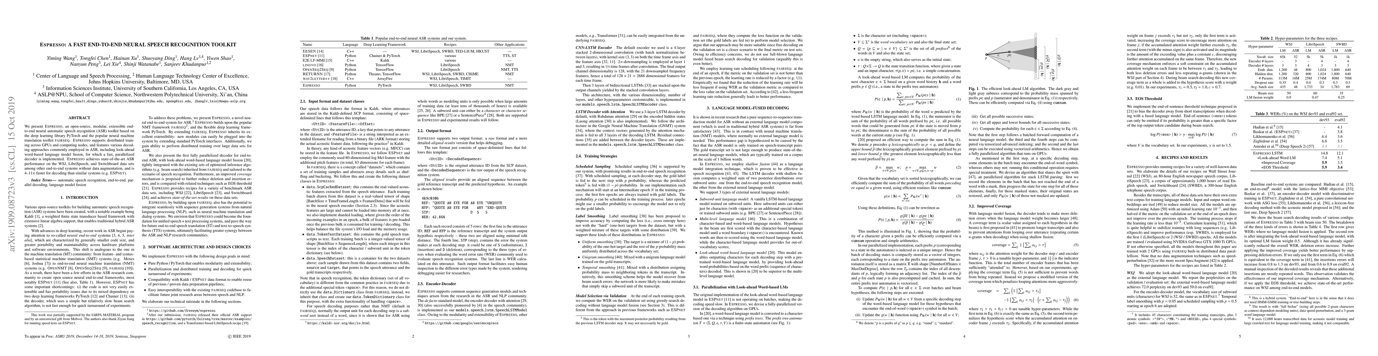 Espresso is an open-source neural speech recognition toolkit using PyTorch and fairseq, achieving state-of-the-art performance without data augmentation and offering significantly faster decoding speeds compared to similar systems.