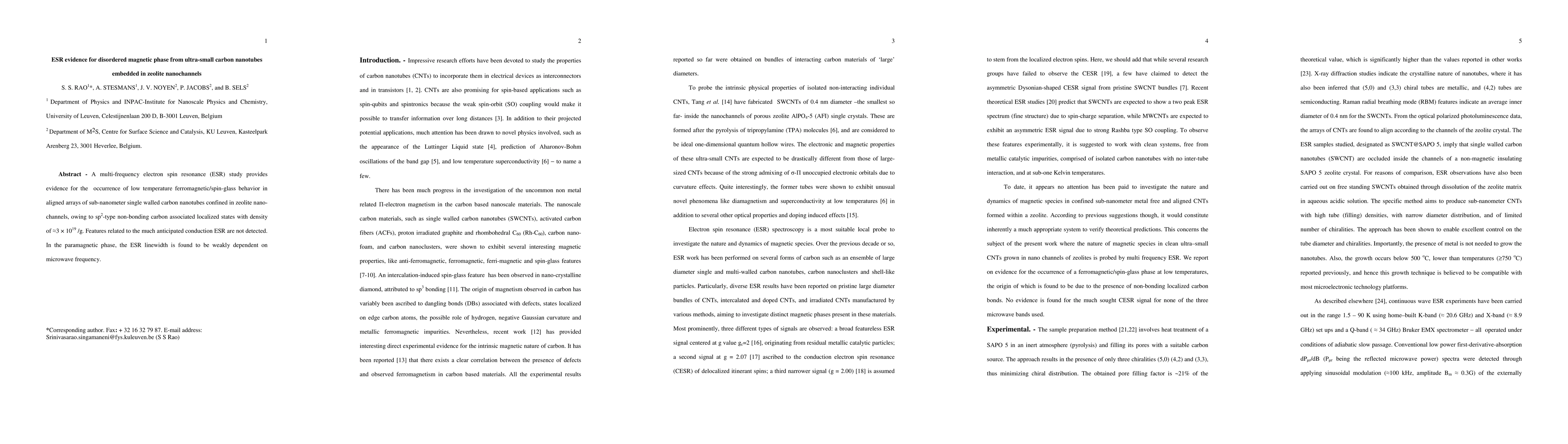 A multi-frequency electron spin resonance (ESR) study provides evidence for the occurrence of low temperature ferromagnetic/spin-glass behavior in aligned arrays of sub-nanometer single walled carbon nanotubes confined in zeolite nano-channels, owing to sp2-type non-bonding carbon associated localized states with density of ~3 x 1019 /g. Features related to the much anticipated conduction ESR are not detected. In the paramagnetic phase, the ESR linewidth is found to be weakly dependent on microwave frequency.