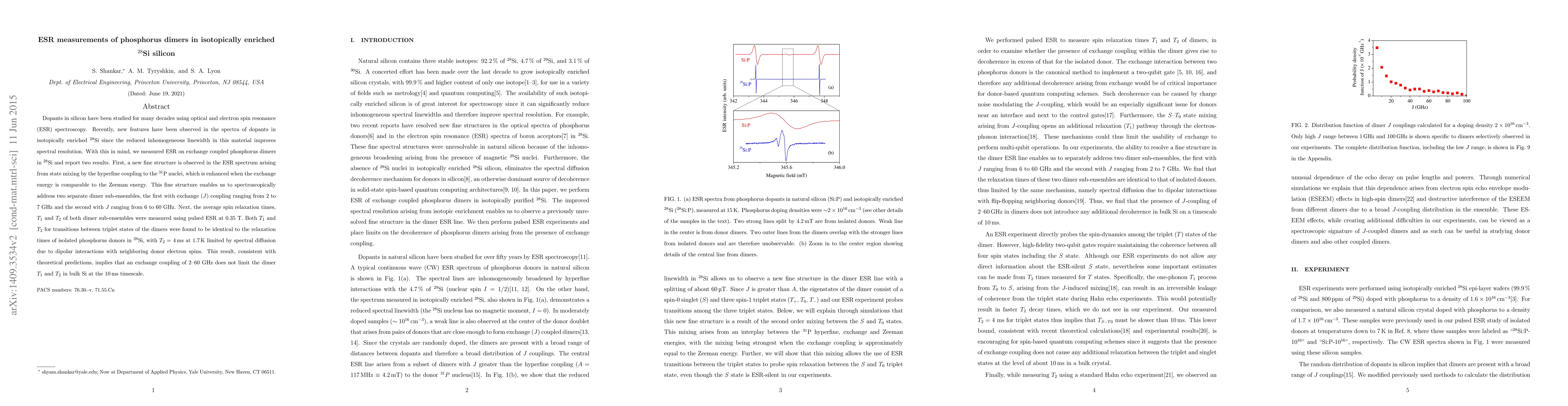 This paper reports ESR measurements on exchange-coupled phosphorus dimers in isotopically enriched 28Si, revealing new fine structure due to hyperfine coupling and identifying two distinct dimer sub-ensembles with varying exchange coupling. The study also finds that the spin relaxation times T1 and T2 for these dimers are similar to those of isolated phosphorus donors, indicating that exchange coupling does not limit relaxation times in bulk Si.