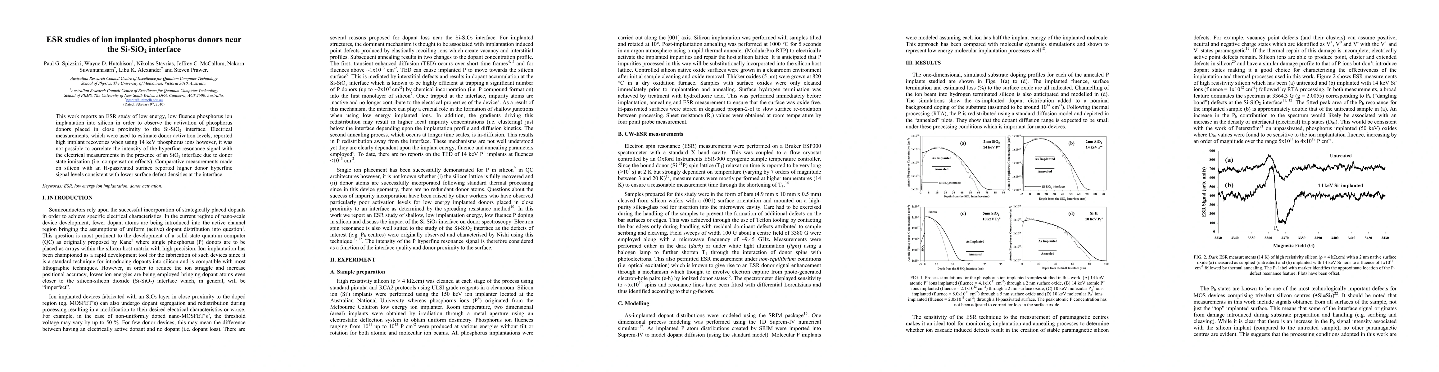 This ESR study investigates the activation of phosphorus donors near the Si-SiO2 interface following low energy ion implantation, finding high donor activation but no correlation between ESR signals and electrical measurements due to compensation effects. Comparatively, H-passivated silicon surfaces showed higher hyperfine signals, indicating reduced interface defects.
