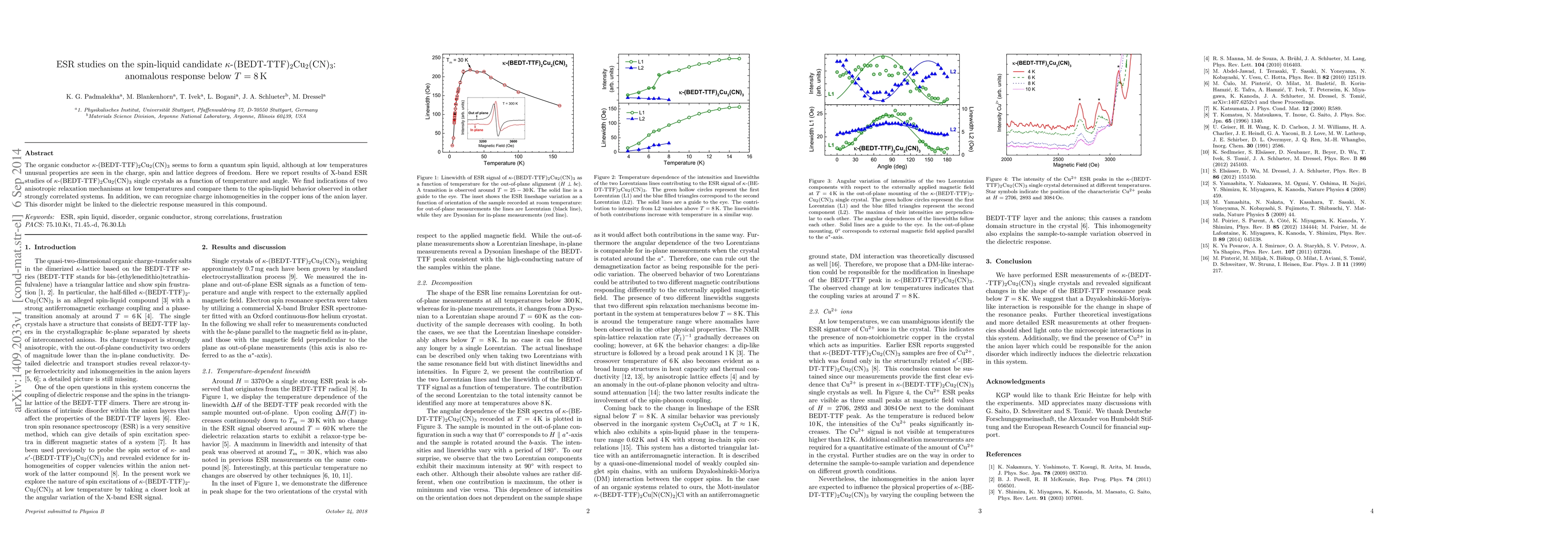 This paper reports X-band ESR studies on the organic conductor $\kappa$-(BEDT-TTF)$_2$Cu$_2$(CN)$_{3}$, revealing two anisotropic relaxation mechanisms at low temperatures indicative of spin-liquid behavior. The study also identifies charge inhomogeneities in the copper ions, potentially linked to the compound's dielectric response.