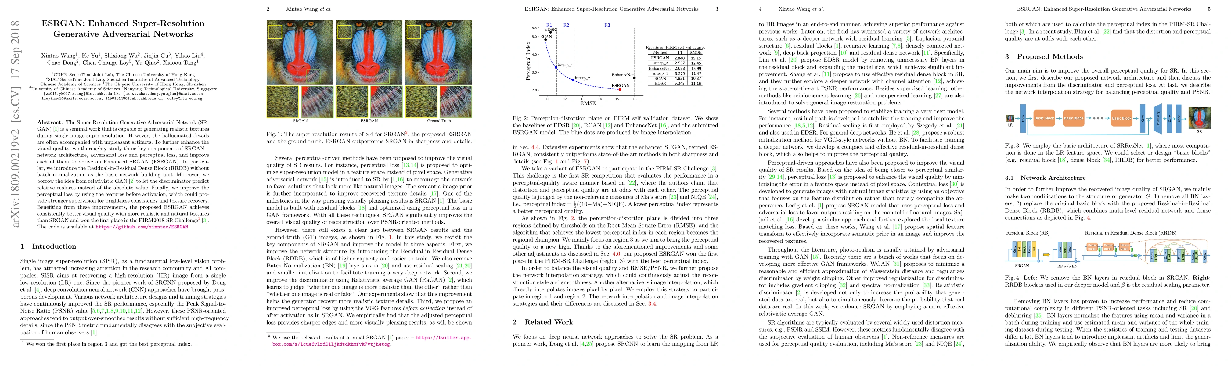 The Super-Resolution Generative Adversarial Network (SRGAN) is a seminal work that is capable of generating realistic textures during single image super-resolution. However, the hallucinated details are often accompanied with unpleasant artifacts. To further enhance the visual quality, we thoroughly study three key components of SRGAN - network architecture, adversarial loss and perceptual loss, and improve each of them to derive an Enhanced SRGAN (ESRGAN). In particular, we introduce the Residual-in-Residual Dense Block (RRDB) without batch normalization as the basic network building unit. Moreover, we borrow the idea from relativistic GAN to let the discriminator predict relative realness instead of the absolute value. Finally, we improve the perceptual loss by using the features before activation, which could provide stronger supervision for brightness consistency and texture recovery. Benefiting from these improvements, the proposed ESRGAN achieves consistently better visual quality with more realistic and natural textures than SRGAN and won the first place in the PIRM2018-SR Challenge. The code is available at https://github.com/xinntao/ESRGAN .