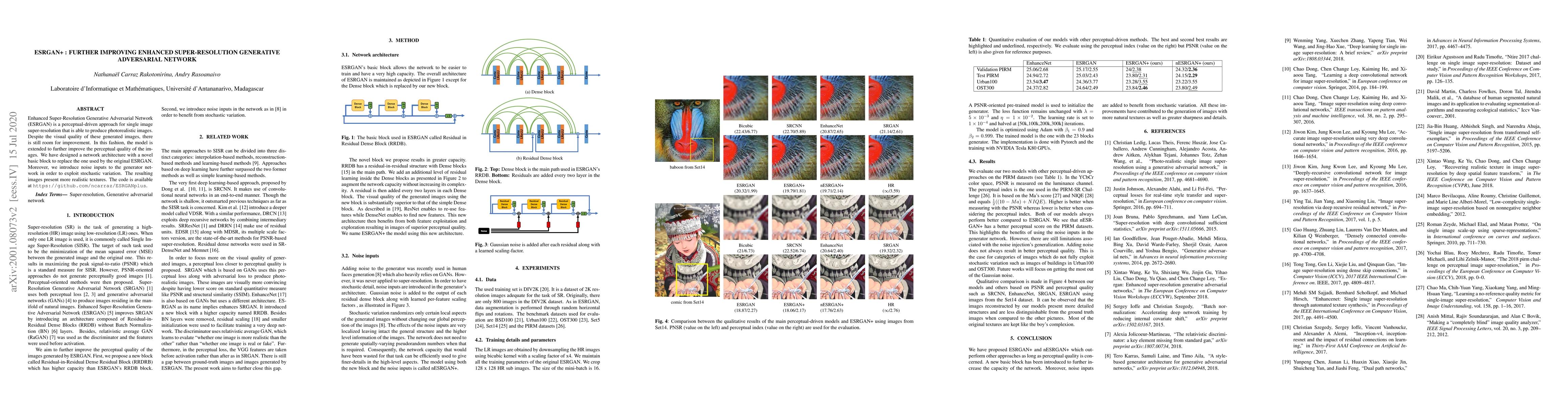 ESRGAN+ enhances the original ESRGAN model by introducing a new block and noise inputs to the generator network, resulting in more realistic textures and improved perceptual quality for super-resolution images. The updated code is available for public use.