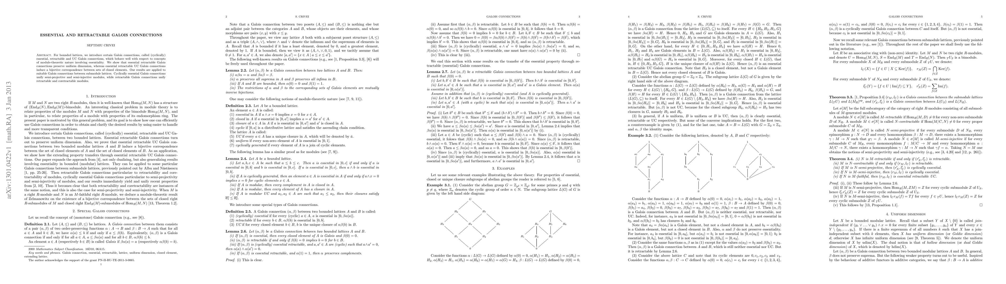 This paper introduces various types of Galois connections for bounded lattices, specifically essential, retractable, and UC Galois connections, which maintain properties relevant to module theory. It demonstrates that essential retractable Galois connections preserve uniform dimension and that essential retractable UC Galois connections establish a bijection between closed elements, with applications to submodule lattices and unifying semi-projective and semi-injective modules.