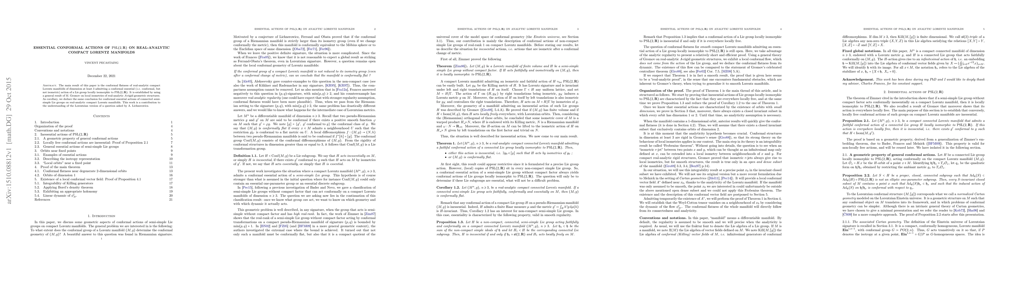 This paper proves the conformal flatness of real-analytic compact Lorentz manifolds of dimension at least $3$ with a conformal essential action of PSL(2,R). It utilizes M. Gromov's result on local isometries to establish this, contributing to the understanding of Lorentzian structures.