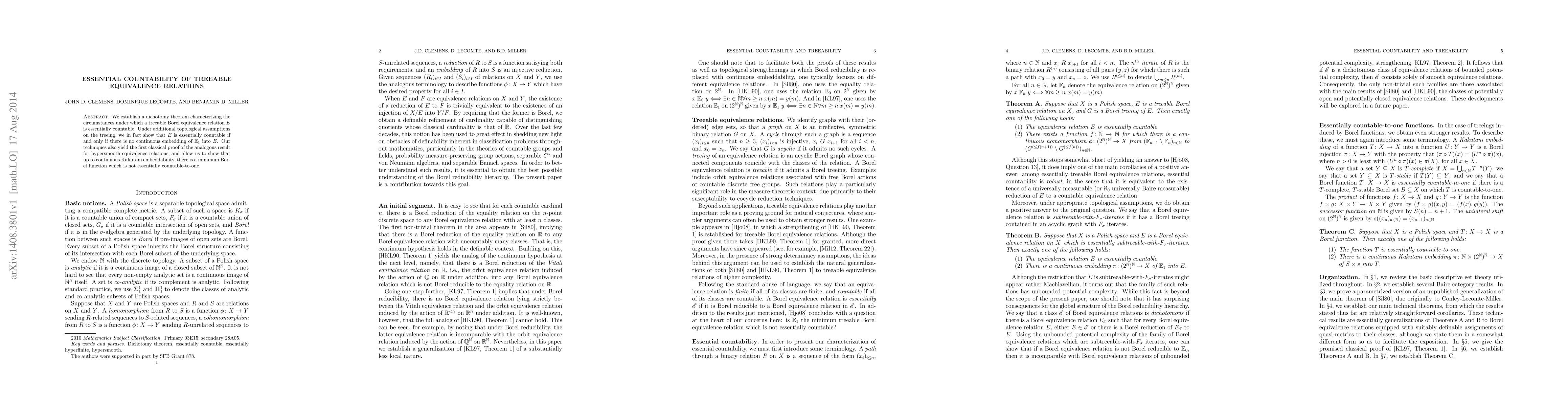 We establish a dichotomy theorem characterizing the circumstances under which a treeable Borel equivalence relation E is essentially countable. Under additional topological assumptions on the treeing, we in fact show that E is essentially countable if and only if there is no continuous embedding of E1 into E. Our techniques also yield the first classical proof of the analogous result for hypersmooth equivalence relations, and allow us to show that up to continuous Kakutani embeddability, there is a minimum Borel function which is not essentially countable-to-one.