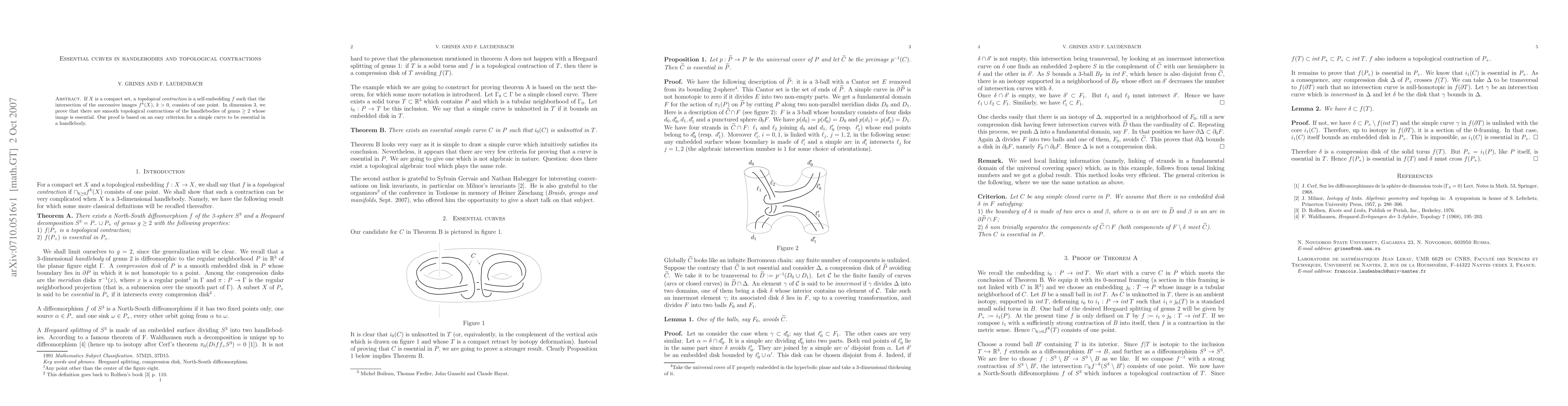 If $X$ is a compact set, a {\it topological contraction} is a self-embedding $f$ such that the intersection of the successive images $f^k(X)$, $k>0$, consists of one point. In dimension 3, we prove that there are smooth topological contractions of the handlebodies of genus $\geq 2$ whose image is essential. Our proof is based on an easy criterion for a simple curve to be essential in a handlebody.