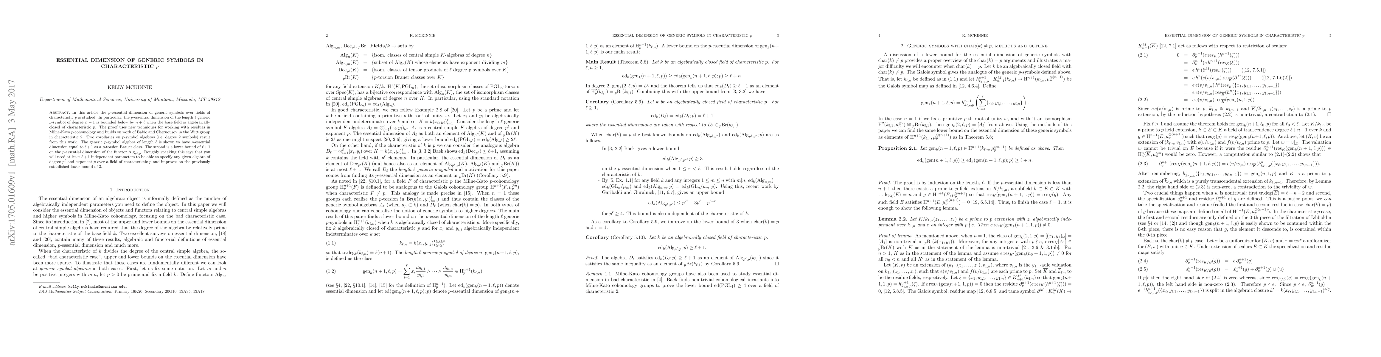 The $p$-essential dimension of generic symbols over fields of characteristic $p$ is bounded below by $n+ ext{length}$ for degree $n+1$ symbols, improving previous lower bounds.