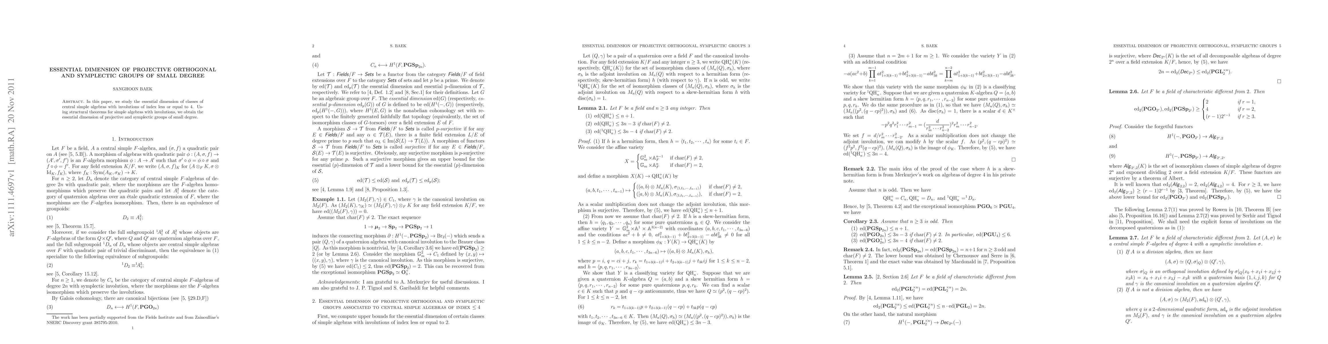 In this paper, we study the essential dimension of classes of central simple algebras with involutions of index less or equal to 4. Using structural theorems for simple algebras with involutions, we obtain the essential dimension of projective and symplectic groups of small degree.