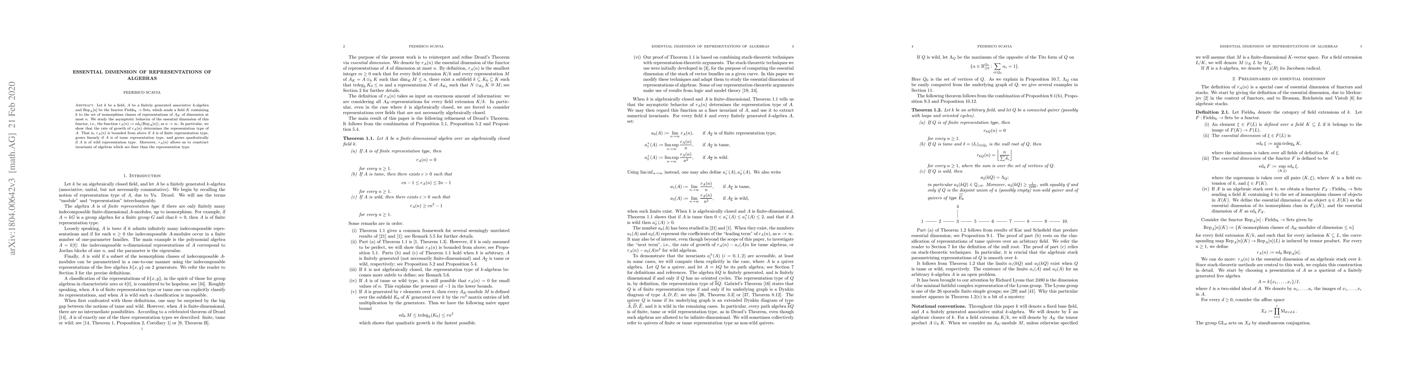 This research explores the asymptotic behavior of the essential dimension (r_A(n)) of representation functors of finitely generated associative k-algebras (A) as dimension (n) approaches infinity. It establishes that r_A(n)'s growth rate—bounded for finite type, linear for tame type, and quadratic for wild type—distinguishes representation types of A, serving as a finer invariant for comparison among algebras of the same representation type.