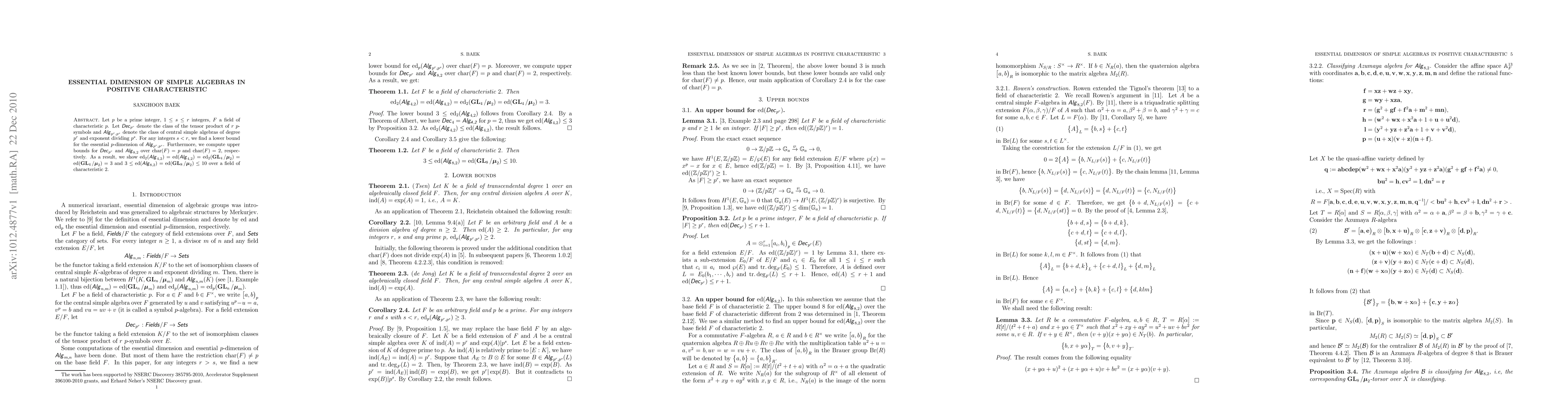 Researchers find lower bounds for the essential dimension of simple algebras in positive characteristic and compute upper bounds for specific cases, shedding light on the structure of central simple algebras.