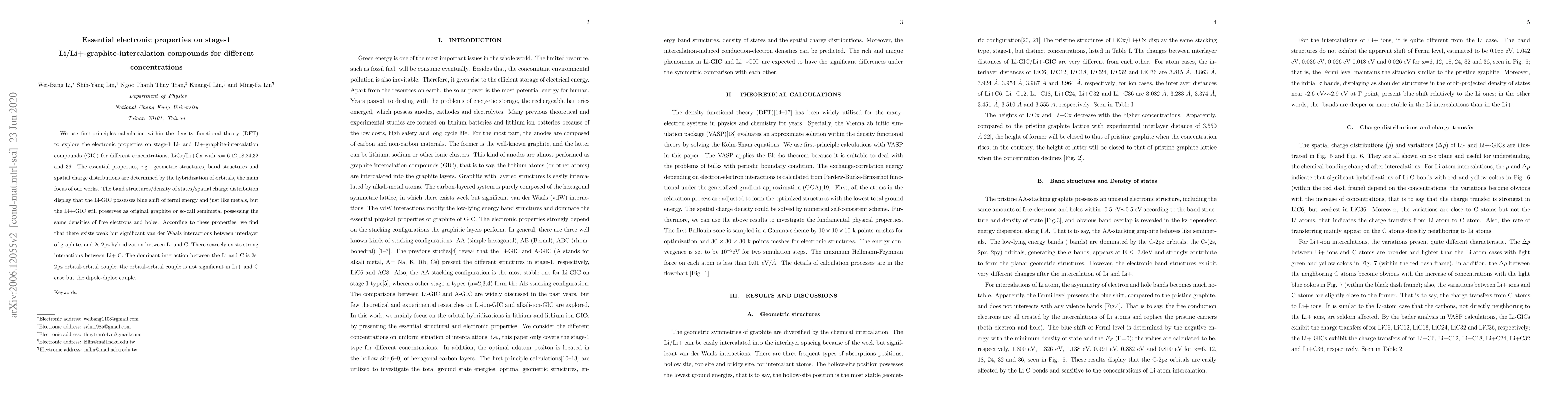 This study uses first-principles DFT calculations to investigate the electronic properties of stage-1 Li/Li+-graphite intercalation compounds at various concentrations. The analysis reveals that Li-GICs exhibit metallic-like behavior with a blue-shifted Fermi energy, while Li+-GICs retain semimetal characteristics similar to pristine graphite.