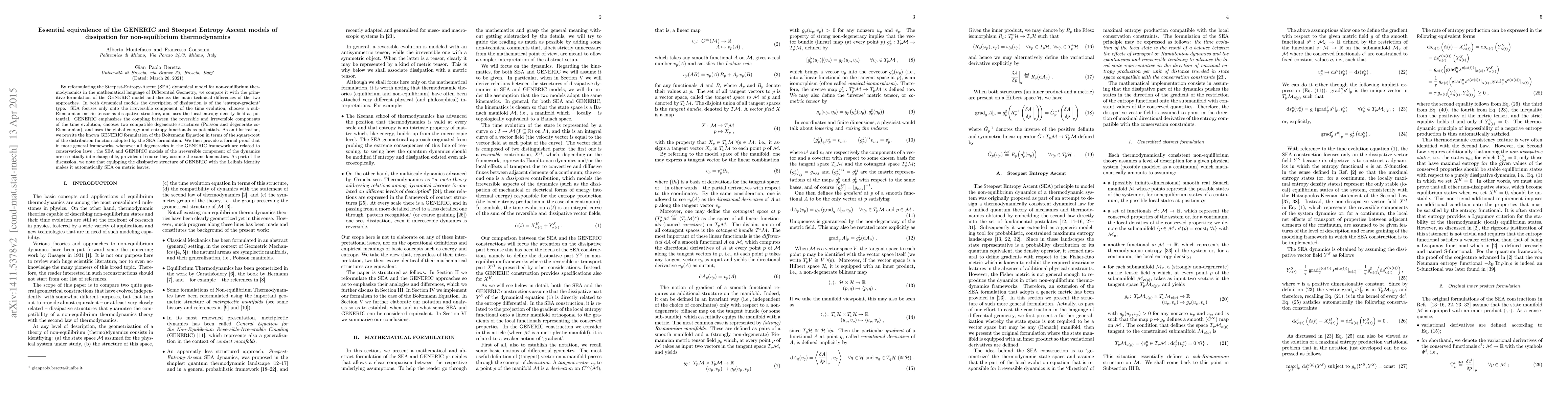 This paper demonstrates the essential equivalence between the GENERIC and Steepest Entropy Ascent (SEA) models for non-equilibrium thermodynamics, showing that both describe dissipation in an "entropy-gradient" manner. It concludes that under certain conditions, these models are interchangeable, highlighting the coupling dynamics and potentials used in each approach.