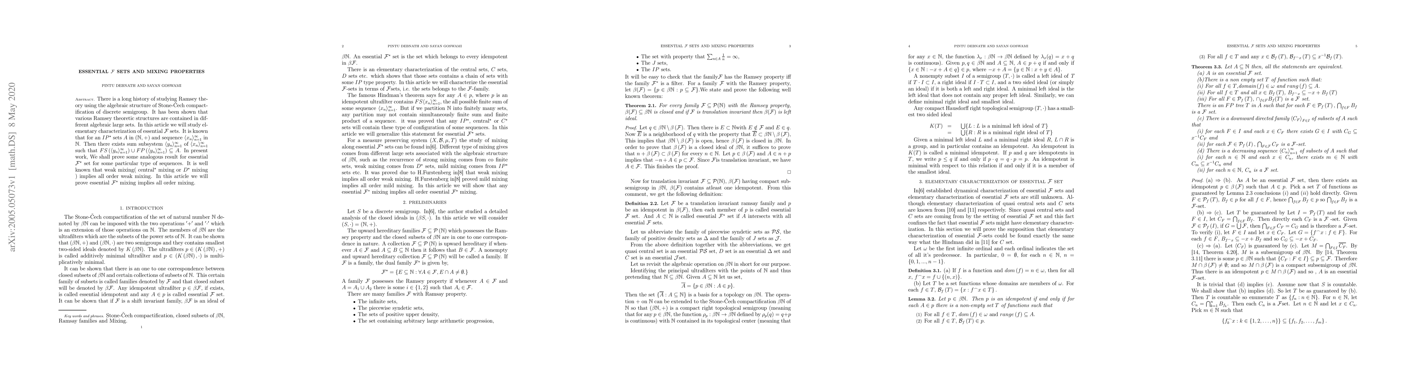 There is a long history of studying Ramsey theory using the algebraic structure of Stone-Cech compactification of discrete semigroup. It has been shown that various Ramsey theoretic structures are contained in different algebraic large sets. In this article we will study elementary characterization of essential F sets. And also study the mixing properties arises from essential F sets.