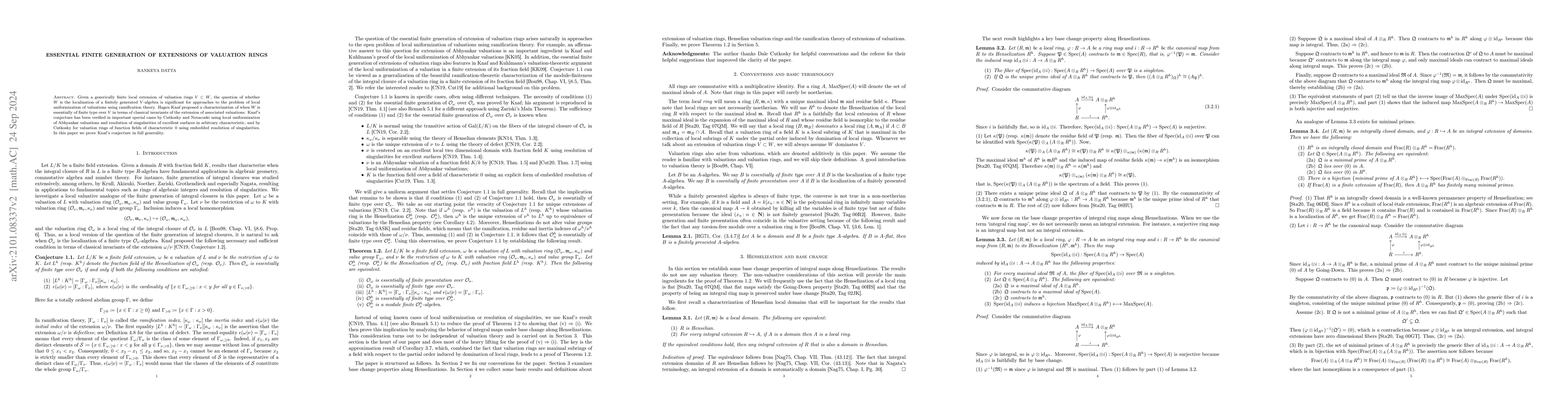 This paper proves Hagen Knaf's conjecture regarding the essential finite generation of extensions of valuation rings, confirming that a generically finite local extension $W$ of valuation ring $V$ is essentially of finite type over $V$ based on classical invariants of the associated valuation extension. This result supports local uniformization approaches using ramification theory.