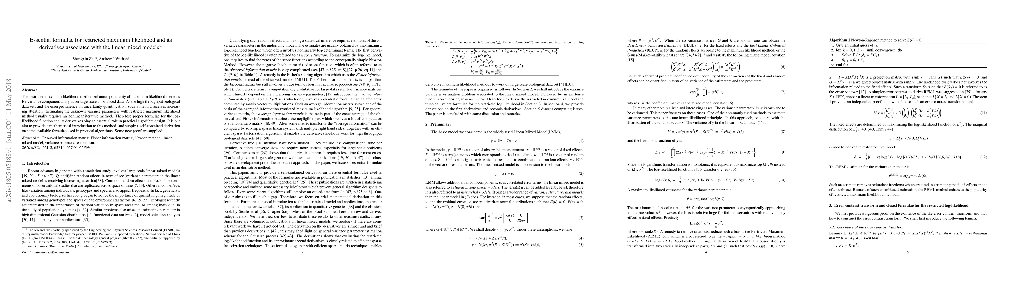 The restricted maximum likelihood method enhances popularity of maximum likelihood methods for variance component analysis on large scale unbalanced data. As the high throughput biological data sets and the emerged science on uncertainty quantification, such a method receives increasing attention. Estimating the unknown variance parameters with restricted maximum likelihood method usually requires an nonlinear iterative method. Therefore proper formulae for the log-likelihood function and its derivatives play an essential role in practical algorithm design. It is our aim to provide a mathematical introduction to this method, and supply a self-contained derivation on some available formulae used in practical algorithms. Some new proof are supplied.