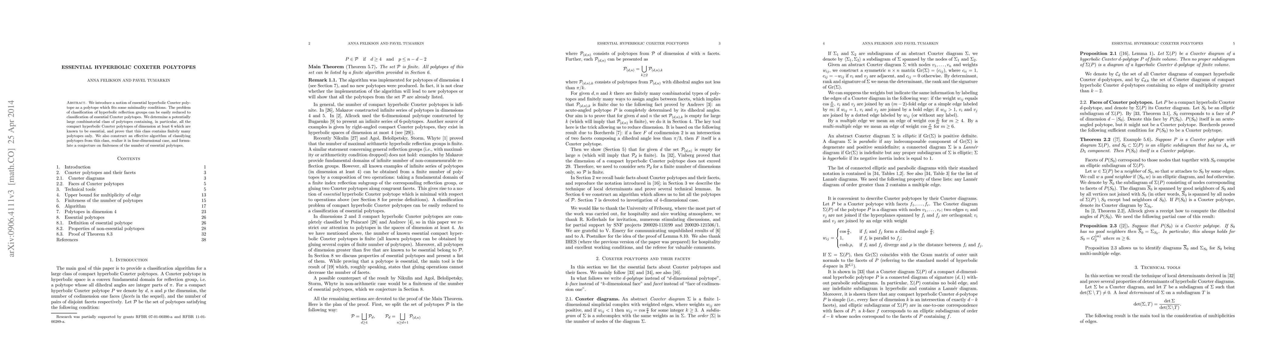 We introduce a notion of essential hyperbolic Coxeter polytope as a polytope which fits some minimality conditions. The problem of classification of hyperbolic reflection groups can be easily reduced to classification of essential Coxeter polytopes. We determine a potentially large combinatorial class of polytopes containing, in particular, all the compact hyperbolic Coxeter polytopes of dimension at least 6 which are known to be essential, and prove that this class contains finitely many polytopes only. We also construct an effective algorithm of classifying polytopes from this class, realize it in four-dimensional case, and formulate a conjecture on finiteness of the number of essential polytopes.