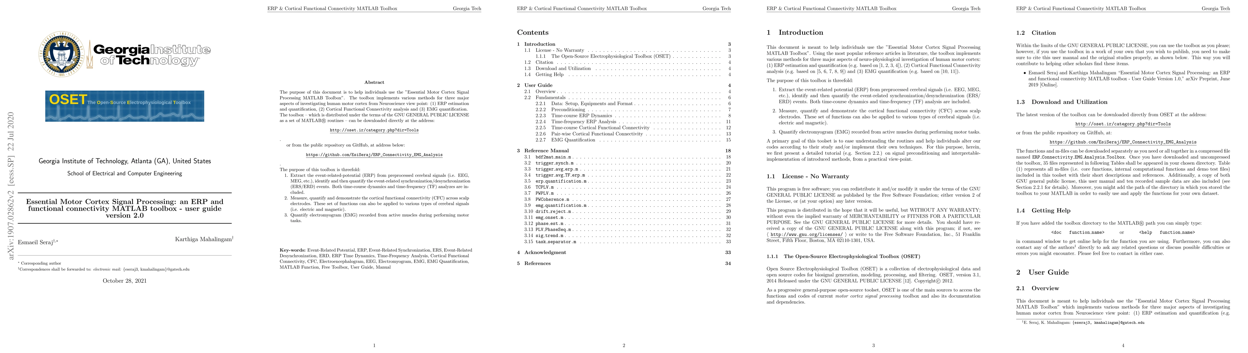 This user guide introduces the "Essential Motor Cortex Signal Processing MATLAB Toolbox" for analyzing human motor cortex through ERP estimation, cortical functional connectivity analysis, and EMG quantification. The toolbox is freely available under the GNU GENERAL PUBLIC LICENSE and can be downloaded from specified online repositories.