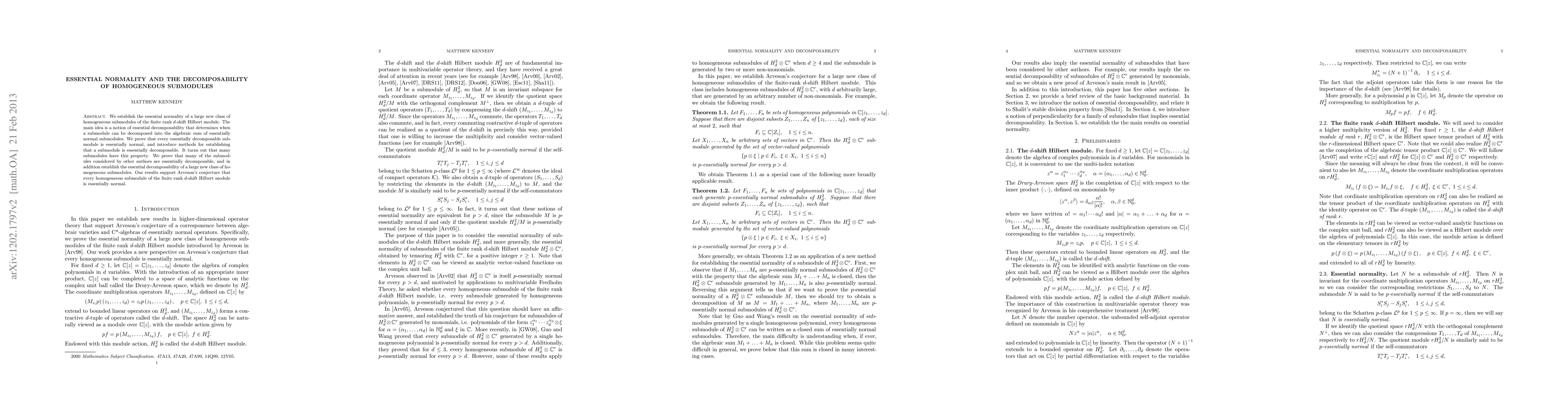 We establish the essential normality of a large new class of homogeneous submodules of the finite rank d-shift Hilbert module. The main idea is a notion of essential decomposability that determines when an arbitrary submodule can be decomposed into the sum of essentially normal submodules. We prove that every essentially decomposable submodule is essentially normal, and using ideas from convex geometry, we introduce methods for establishing that a submodule is essentially decomposable. It turns out that many homogeneous submodules of the finite rank d-shift Hilbert module have this property. We prove that many of the submodules considered by other authors are essentially decomposable, and in addition establish the essential decomposability of a large new class of homogeneous submodules. Our results support Arveson's conjecture that every homogeneous submodule of the finite rank d-shift Hilbert module is essentially normal.