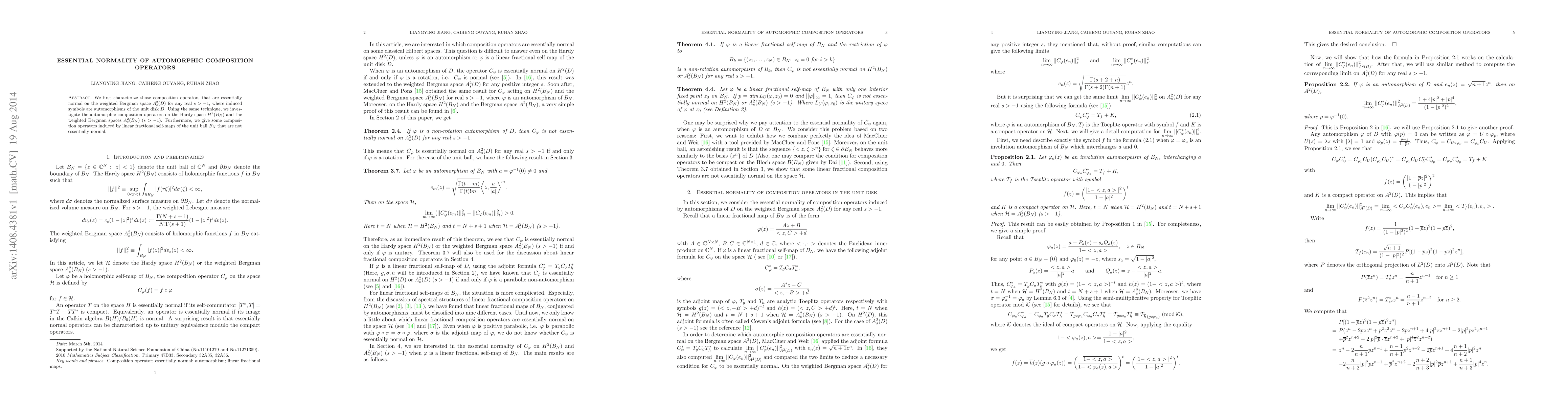 This paper characterizes essentially normal composition operators on weighted Bergman and Hardy spaces, showing that certain automorphic composition operators retain this property, while others induced by linear fractional self-maps of the unit ball do not.