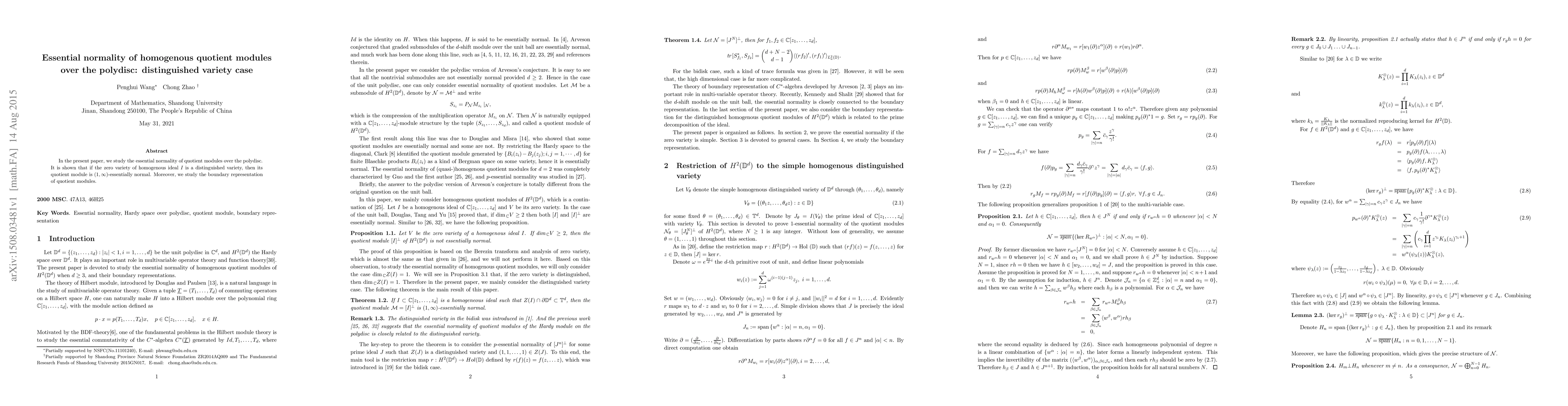 In the present paper, we study the essential normality of quotient modules over the polydisc. It is shown that if the zero variety of homogenous ideal $I$ is a distinguished variety, then its quotient module is $(1,\infty)$-essentially normal. Moreover, we study the boundary representation of quotient modules.