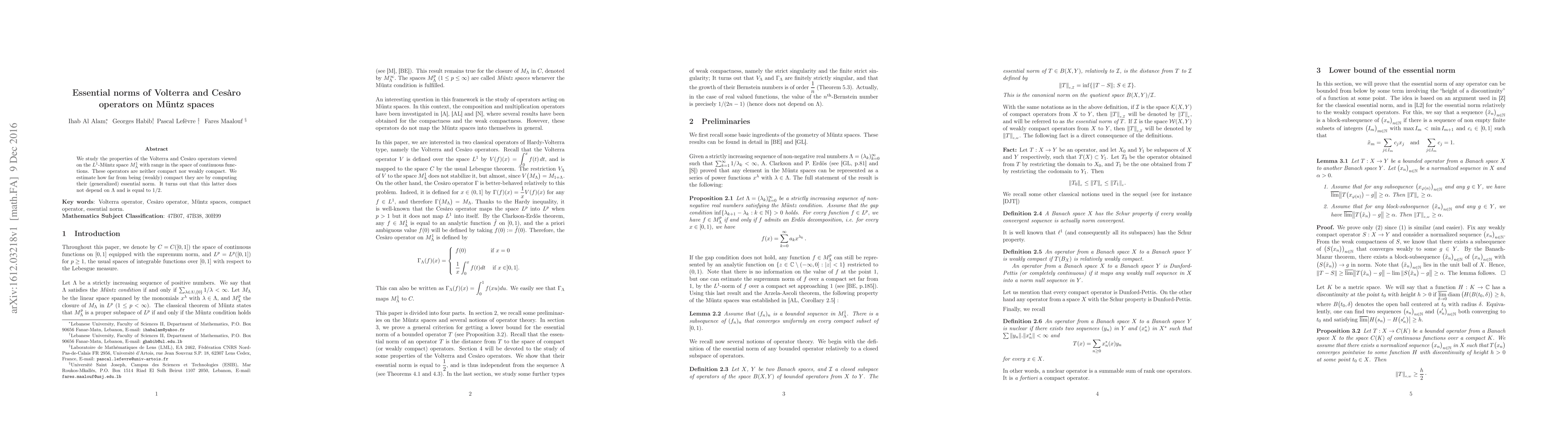This paper investigates the essential norms of Volterra and Cesàro operators on the $L^1$-Müntz space $M_\Lambda^1$, revealing they are neither compact nor weakly compact. The generalized essential norm is computed to be $1/2$, independent of $\Lambda$.