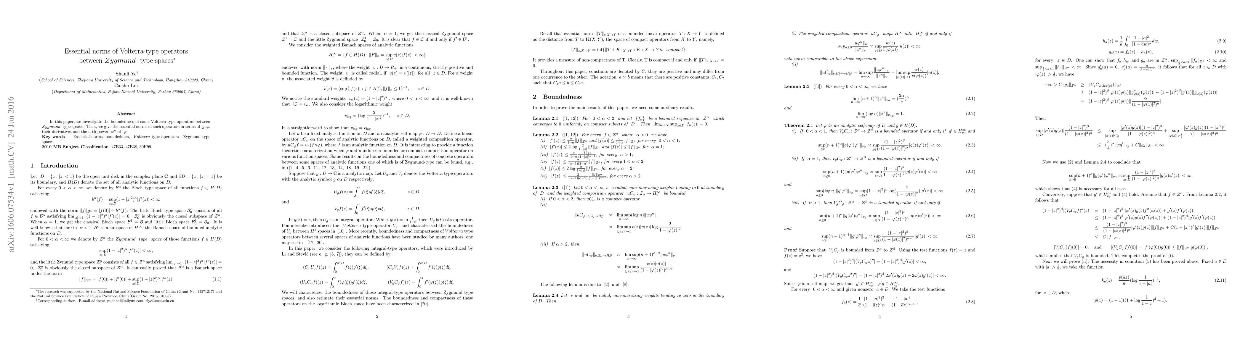 Summary: This paper examines the boundedness and essential norms of Volterra-type operators acting between Zygmund type spaces, providing expressions for the essential norms in terms of functions $g$, $\varphi$, their derivatives, and the $n$-th power of $\varphi$.