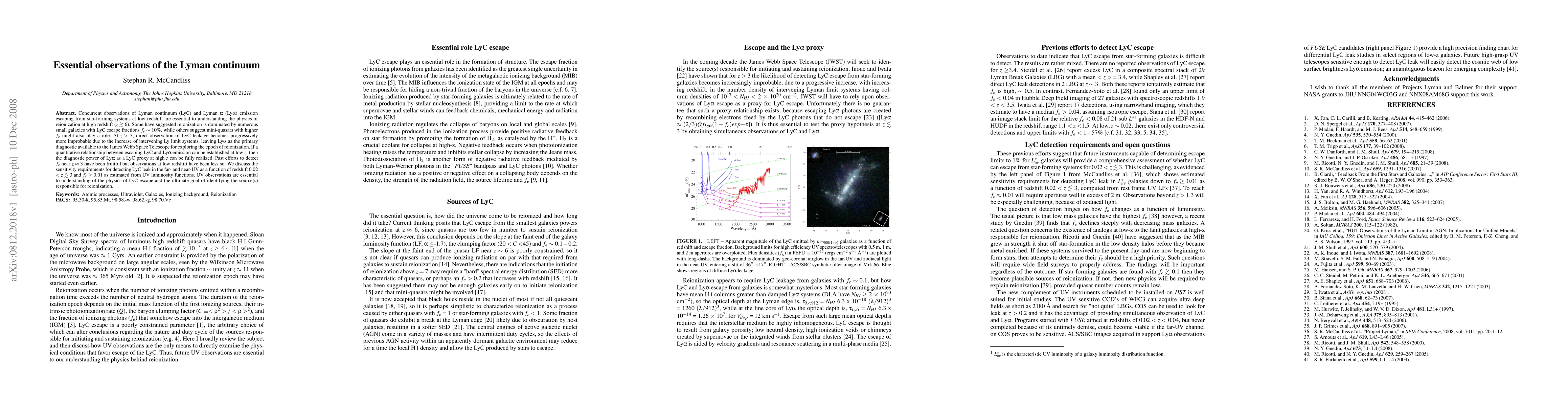 Concurrent observations of Lyman continuum (LyC) and Lyman-alpha (Lya) emission escaping from star-forming systems at low redshift are essential to understanding the physics of reionization at high redshift (z >~ 6). Some have suggested reionization is dominated by numerous small galaxies with LyC escape fractions f_e ~ 10%, while others suggest mini-quasars with higher f_e might also play a role. At z > 3, direct observation of LyC leakage becomes progressively more improbable due to the increase of intervening Ly limit systems, leaving Lya as the primary diagnostic available to the James Webb Space Telescope for exploring the epoch of reionization. If a quantitative relationship between escaping LyC and Lya emission can be established at low z, then the diagnostic power of Lya as a LyC proxy at high z can be fully realized. Past efforts to detect f_e near z ~ 3 have been fruitful but observations at low redshift have been less so. We discuss the sensitivity requirements for detecting LyC leak in the far- and near-UV as a function of redshift 0.02 < z ~< 3 and f_e >= 0.01 as estimated from UV luminosity functions. UV observations are essential to understanding of the physics of LyC escape and the ultimate goal of identifying the source(s) responsible for reionization.