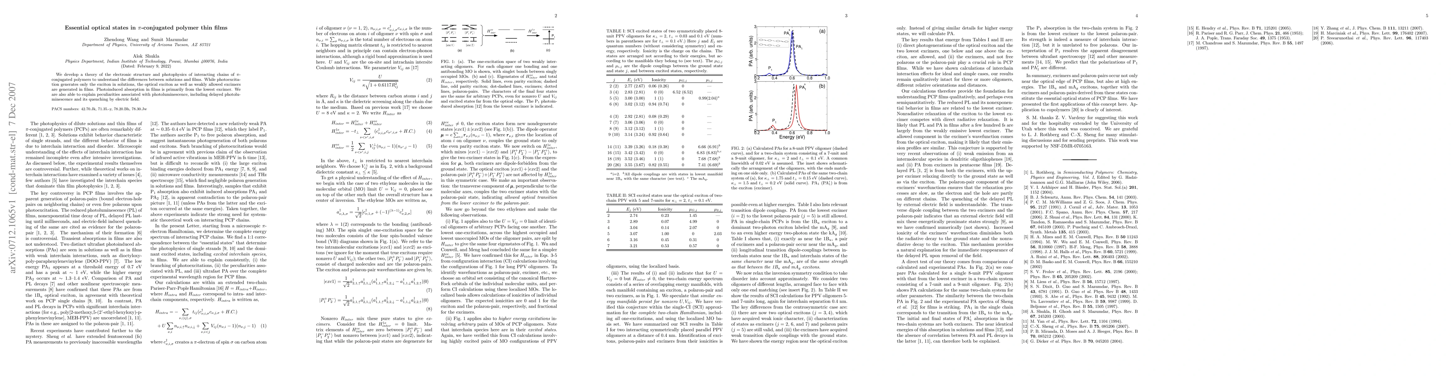 We develop a theory of the electronic structure and photophysics of interacting chains of $\pi$-conjugated polymers to understand the differences between solutions and films. While photoexcitation generates only the exciton in solutions, the optical exciton as well as weakly allowed excimers are generated in films. Photoinduced absorption in films is primarily from the lowest excimer. We are also able to explain peculiarities associated with photoluminescence, including delayed photoluminescence and its quenching by electric field.