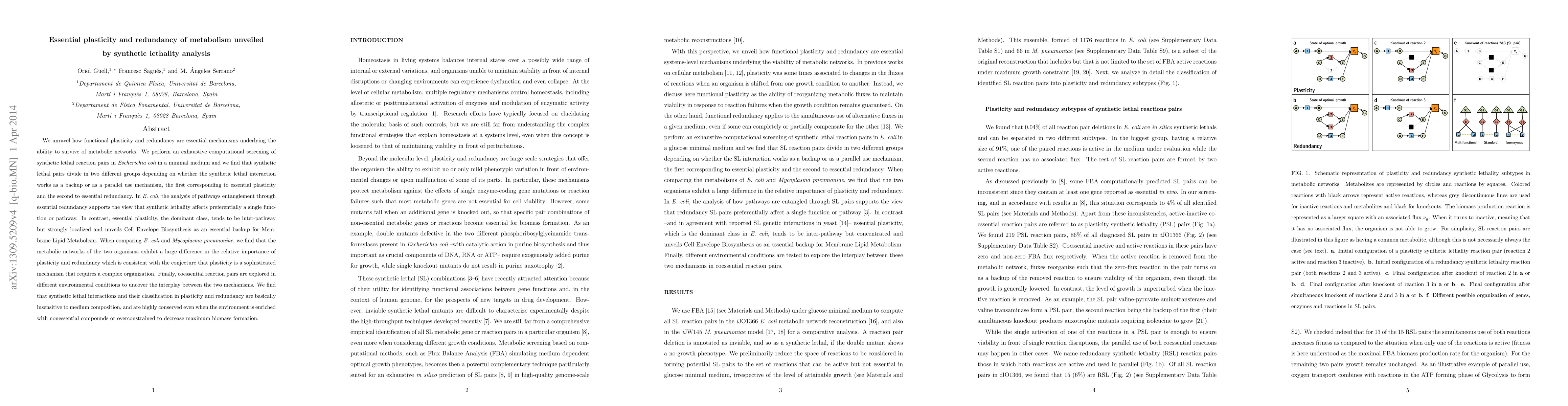We unravel how functional plasticity and redundancy are essential mechanisms underlying the ability to survive of metabolic networks. We perform an exhaustive computational screening of synthetic lethal reaction pairs in Escherichia coli in a minimal medium and we find that synthetic lethal pairs divide in two different groups depending on whether the synthetic lethal interaction works as a backup or as a parallel use mechanism, the first corresponding to essential plasticity and the second to essential redundancy. In E. coli, the analysis of pathways entanglement through essential redundancy supports the view that synthetic lethality affects preferentially a single function or pathway. In contrast, essential plasticity, the dominant class, tends to be inter-pathway but strongly localized and unveils Cell Envelope Biosynthesis as an essential backup for Membrane Lipid Metabolism. When comparing E. coli and Mycoplasma pneumoniae, we find that the metabolic networks of the two organisms exhibit a large difference in the relative importance of plasticity and redundancy which is consistent with the conjecture that plasticity is a sophisticated mechanism that requires a complex organization. Finally, coessential reaction pairs are explored in different environmental conditions to uncover the interplay between the two mechanisms. We find that synthetic lethal interactions and their classification in plasticity and redundancy are basically insensitive to medium composition, and are highly conserved even when the environment is enriched with nonessential compounds or overconstrained to decrease maximum biomass formation.