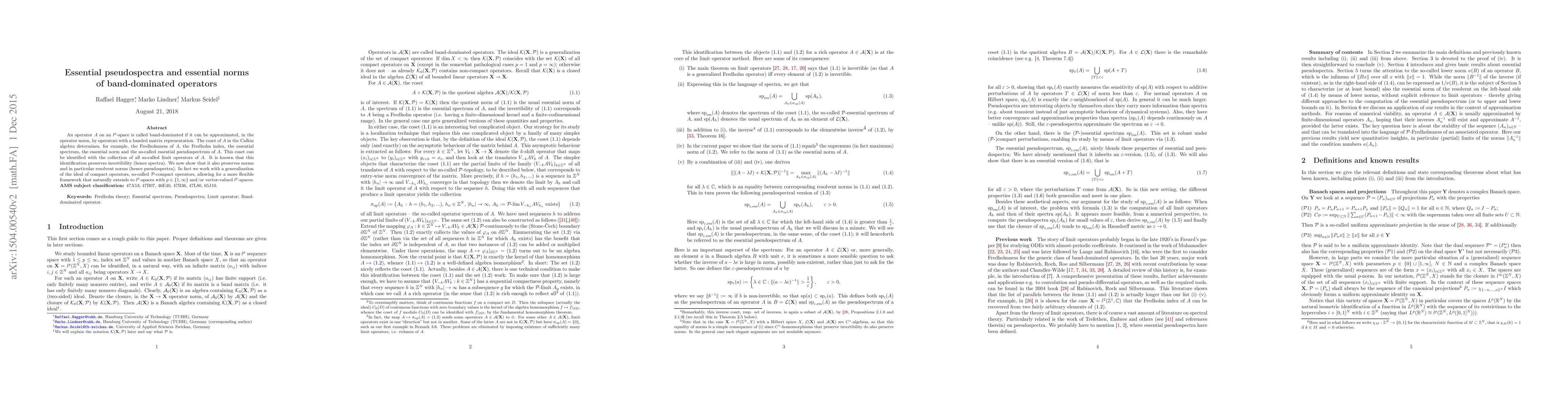 This paper explores band-dominated operators on $l^p$-spaces, demonstrating that their essential norms and pseudospectra are preserved under the identification with limit operators in the Calkin algebra. The study extends to $\mathcal{P}$-compact operators for a broader framework applicable to various $l^p$-spaces.