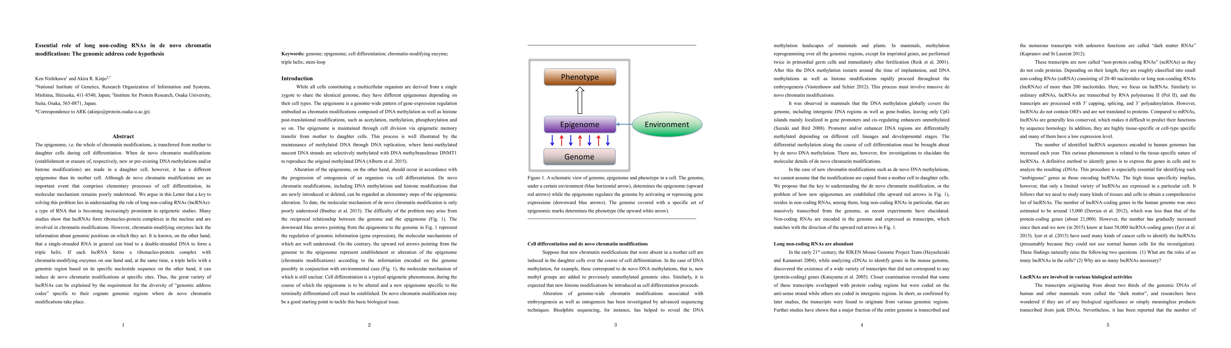 This paper proposes that long non-coding RNAs (lncRNAs) play a crucial role in guiding de novo chromatin modifications during cell differentiation by forming triple helices with specific genomic regions, thus providing the necessary genomic address codes for precise chromatin modification. The diversity of lncRNAs is hypothesized to correspond to the variety of these genomic address codes required for targeted modifications.