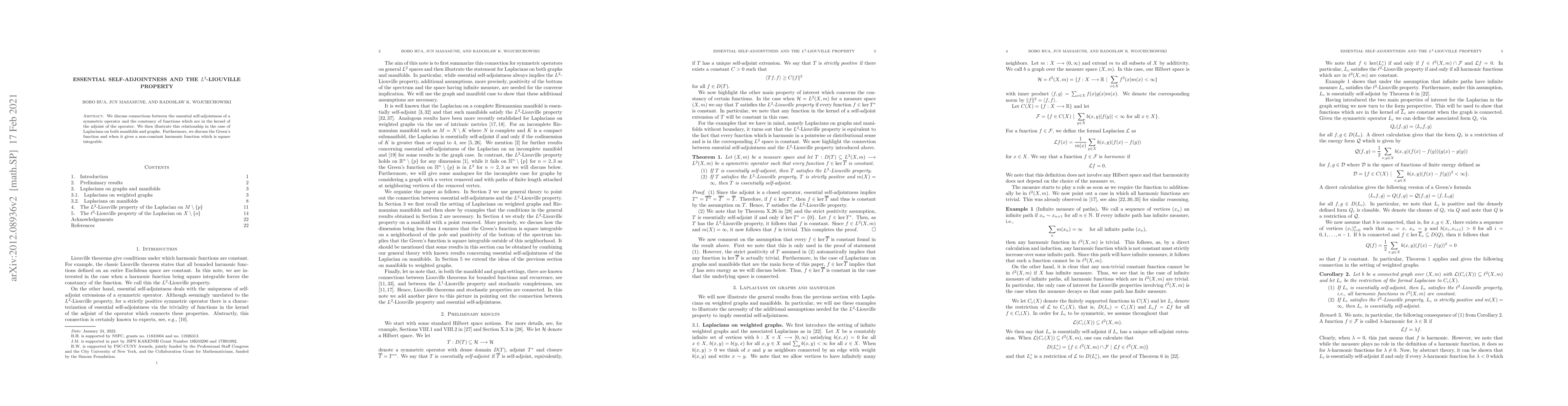 This paper explores the relationship between essential self-adjointness of symmetric operators and the $L^2$-Liouville property, demonstrating these connections through Laplacians on manifolds and graphs, and discussing the implications of the Green's function in providing non-constant harmonic functions.