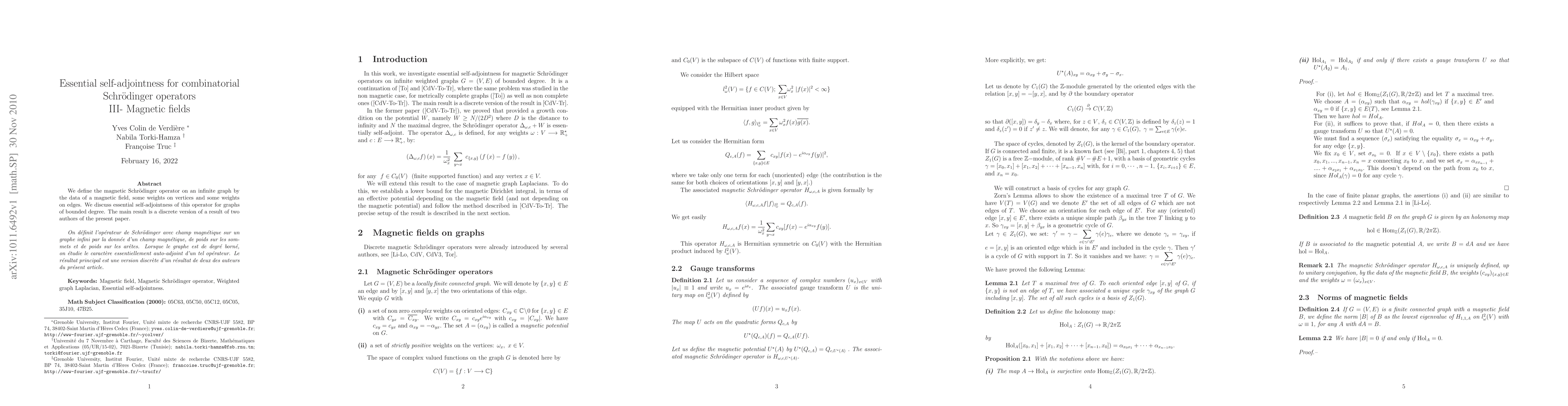 We define the magnetic Schr\"odinger on an infinite graph by the data of a magnetic field, some weights on vertices and some weights on edges . We discuss essential self-adjointness of this operator for graphs of bounded degree. The main result is a discrete version of a result of two authors of the present paper.