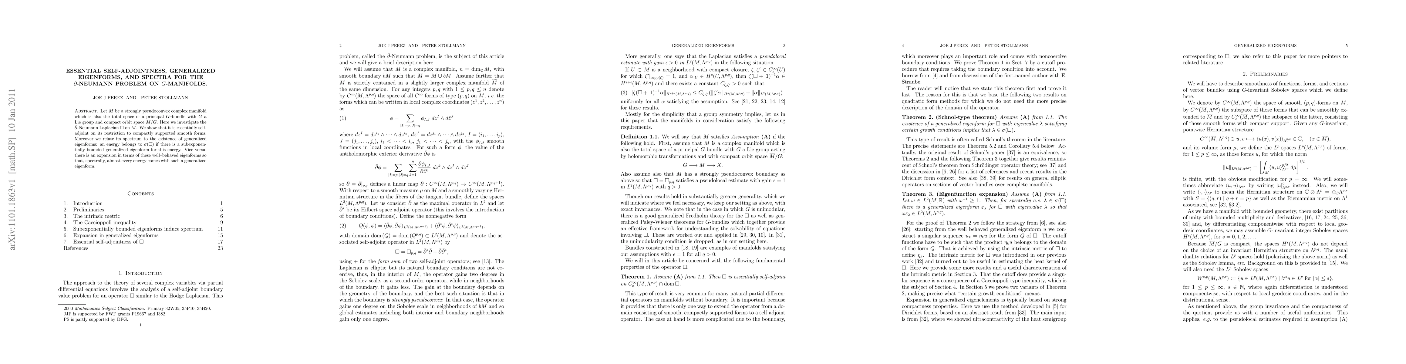 The paper investigates the $ar heta$-Neumann Laplacian on $G$-manifolds and shows that it is essentially self-adjoint with a relation between its spectrum and generalized eigenforms.