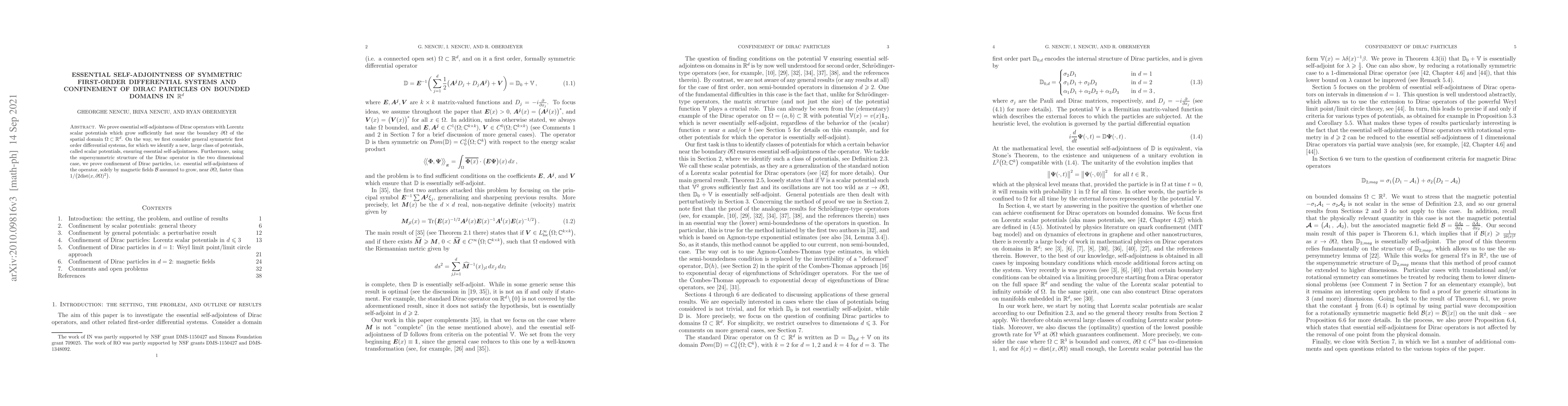This paper proves essential self-adjointness of Dirac operators with rapidly decaying Lorentz scalar potentials near the boundary of a bounded domain in $\mathbb{R}^d$. It also establishes confinement of Dirac particles using magnetic fields that grow faster than $1/(2\text{dist}(x, \partial\Omega)^2)$ near the boundary.