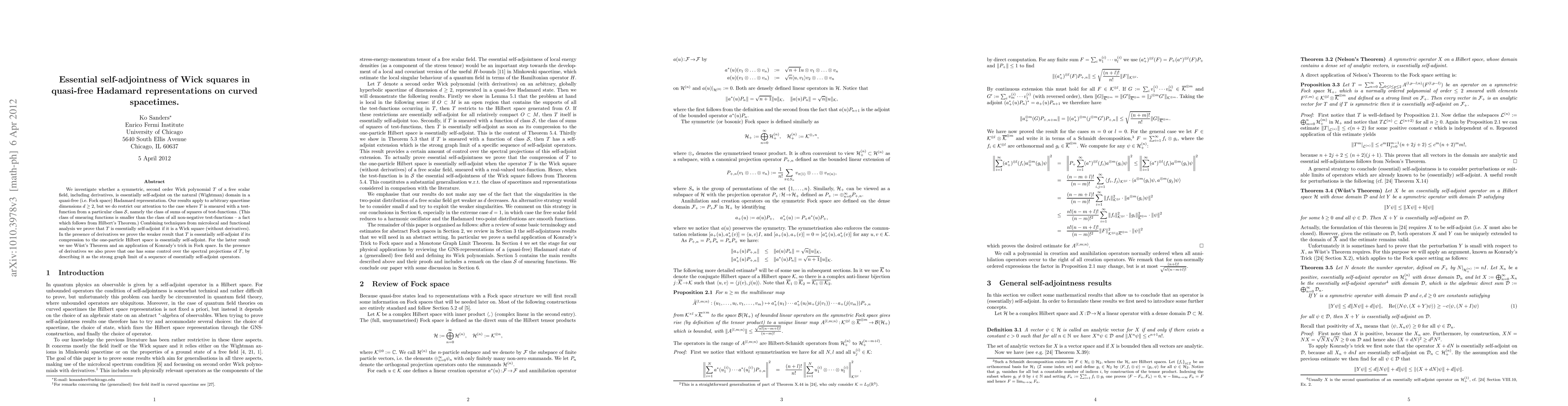 We investigate whether a second order Wick polynomial T of a free scalar field, including derivatives, is essentially self-adjoint on the natural (Wightman) domain in a quasi-free (i.e. Fock space) Hadamard representation. We restrict our attention to the case where T is smeared with a test-function from a particular class S, namely the class of sums of squares of testfunctions. This class of smearing functions is smaller than the class of all non-negative testfunctions -- a fact which follows from Hilbert's Theorem. Exploiting the microlocal spectrum condition we prove that T is essentially self-adjoint if it is a Wick square (without derivatives). More generally we show that T is essentially self-adjoint if its compression to the one-particle Hilbert space is essentially self-adjoint. For the latter result we use W\"ust's Theorem and an application of Konrady's trick in Fock space. In this more general case we also prove that one has some control over the spectral projections of T, by describing it as the strong graph limit of a sequence of essentially self-adjoint operators.