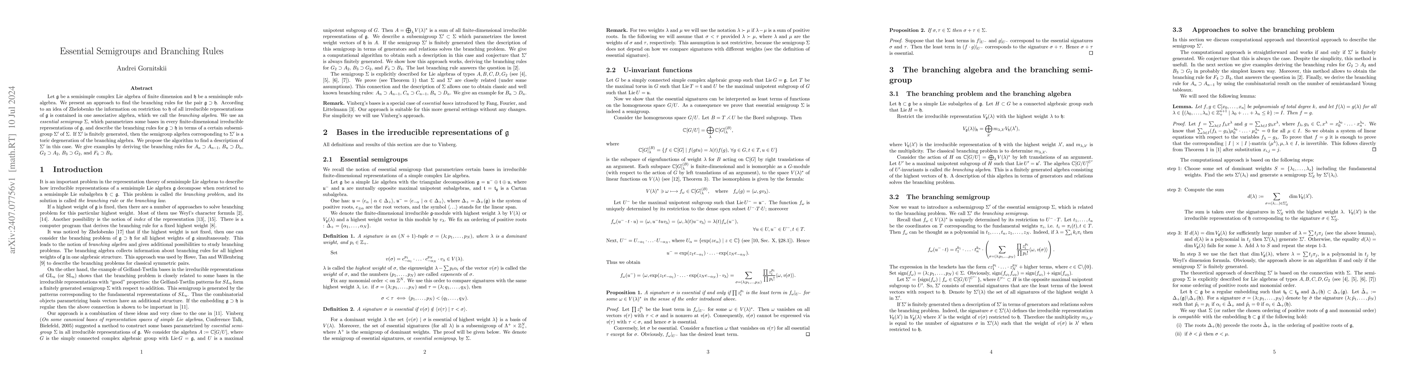 This paper develops an approach to determine branching rules for pairs of semisimple complex Lie algebras, utilizing an essential semigroup $\Sigma$ to parametrize bases in irreducible representations. The method involves a certain subsemigroup $\Sigma'$ and provides an algorithm to describe $\Sigma'$ when finitely generated, with examples for specific branching scenarios.