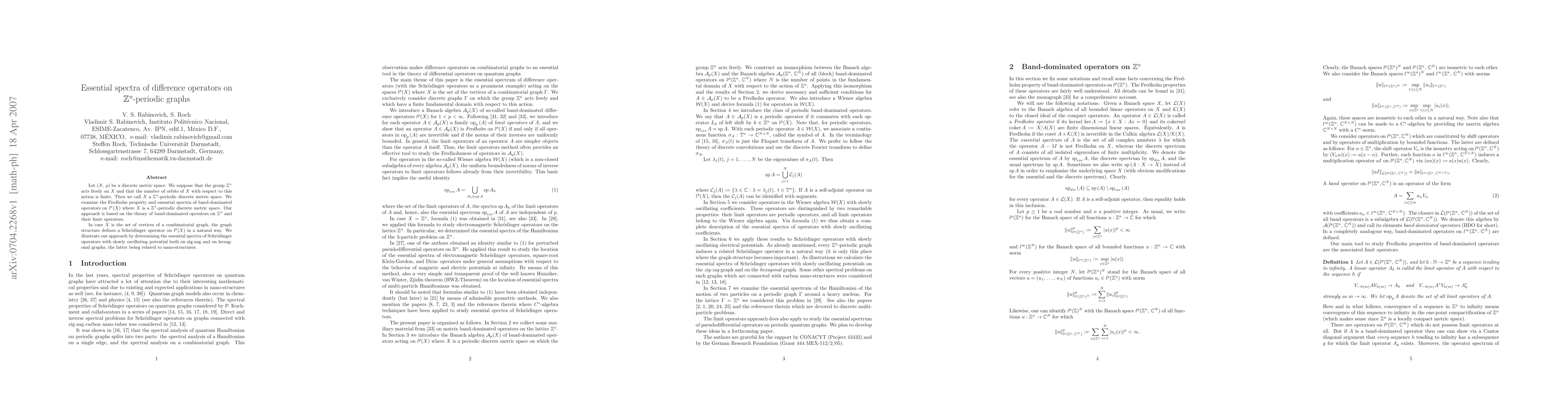 Let $(\cX, \rho)$ be a discrete metric space. We suppose that the group $\sZ^n$ acts freely on $X$ and that the number of orbits of $X$ with respect to this action is finite. Then we call $X$ a $\sZ^n$-periodic discrete metric space. We examine the Fredholm property and essential spectra of band-dominated operators on $l^p(X)$ where $X$ is a $\sZ^n$-periodic discrete metric space. Our approach is based on the theory of band-dominated operators on $\sZ^n$ and their limit operators. In case $X$ is the set of vertices of a combinatorial graph, the graph structure defines a Schr\"{o}dinger operator on $l^p(X)$ in a natural way. We illustrate our approach by determining the essential spectra of Schr\"{o}dinger operators with slowly oscillating potential both on zig-zag and on hexagonal graphs, the latter being related to nano-structures.